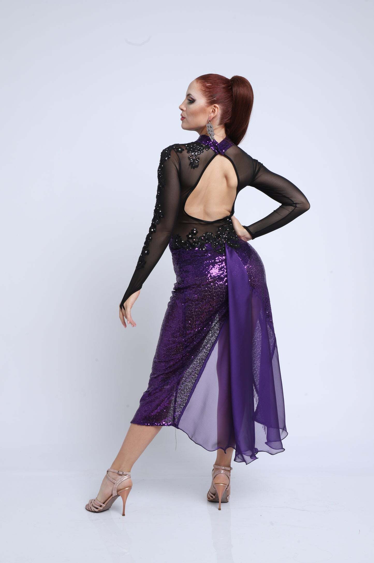 鮮やかなパープル色のスパンコール素材と黒色ネット素材の長袖ステージ用ドレス。