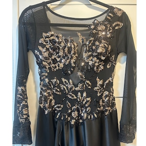 上半身は黒色ネット素材、スカートは黒色サテン素材の長袖ステージ用ドレス。