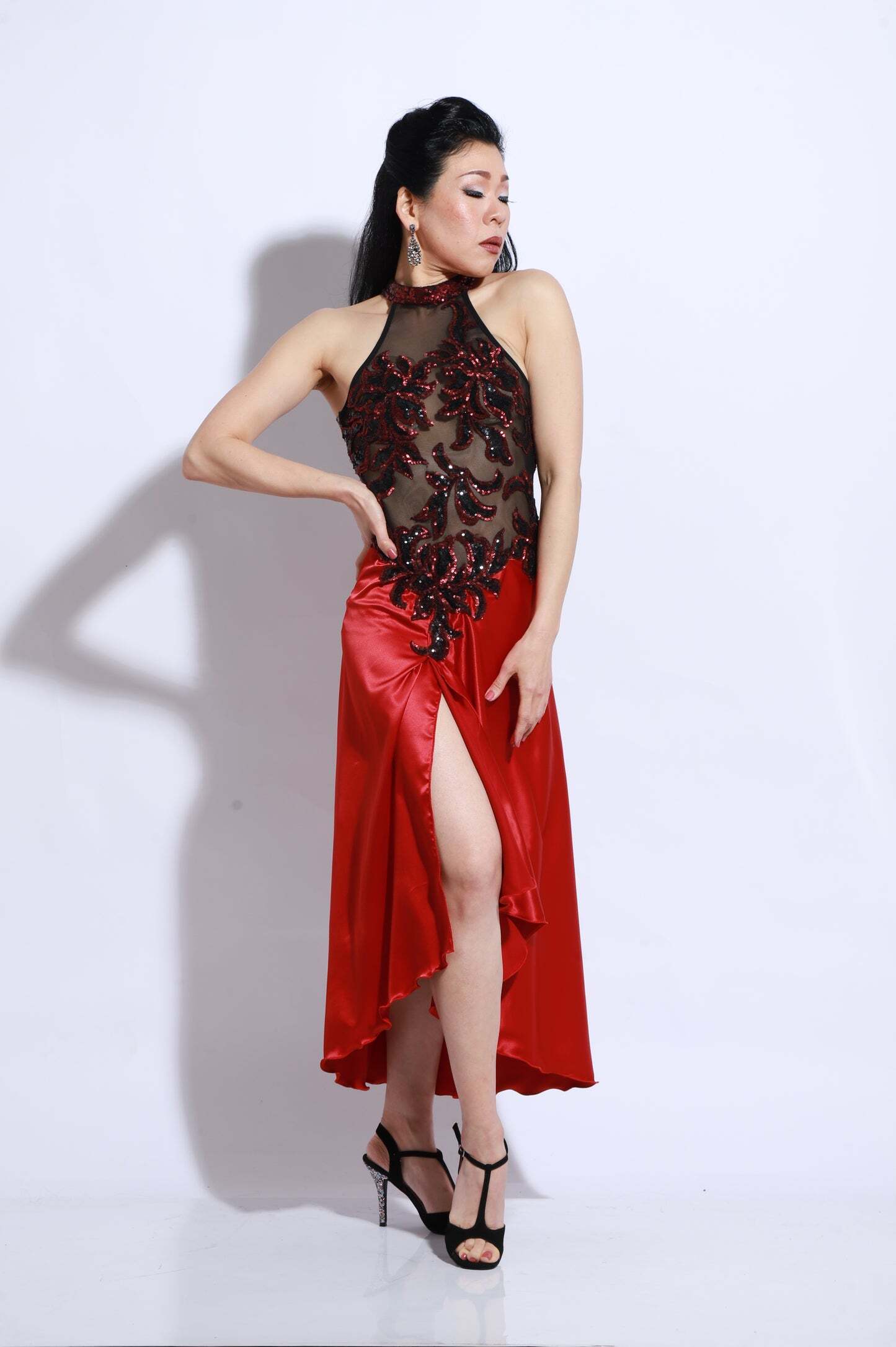 VESTIDO DE MIMI PINZON ステージ用 黒ネット×赤サテンフレアドレス