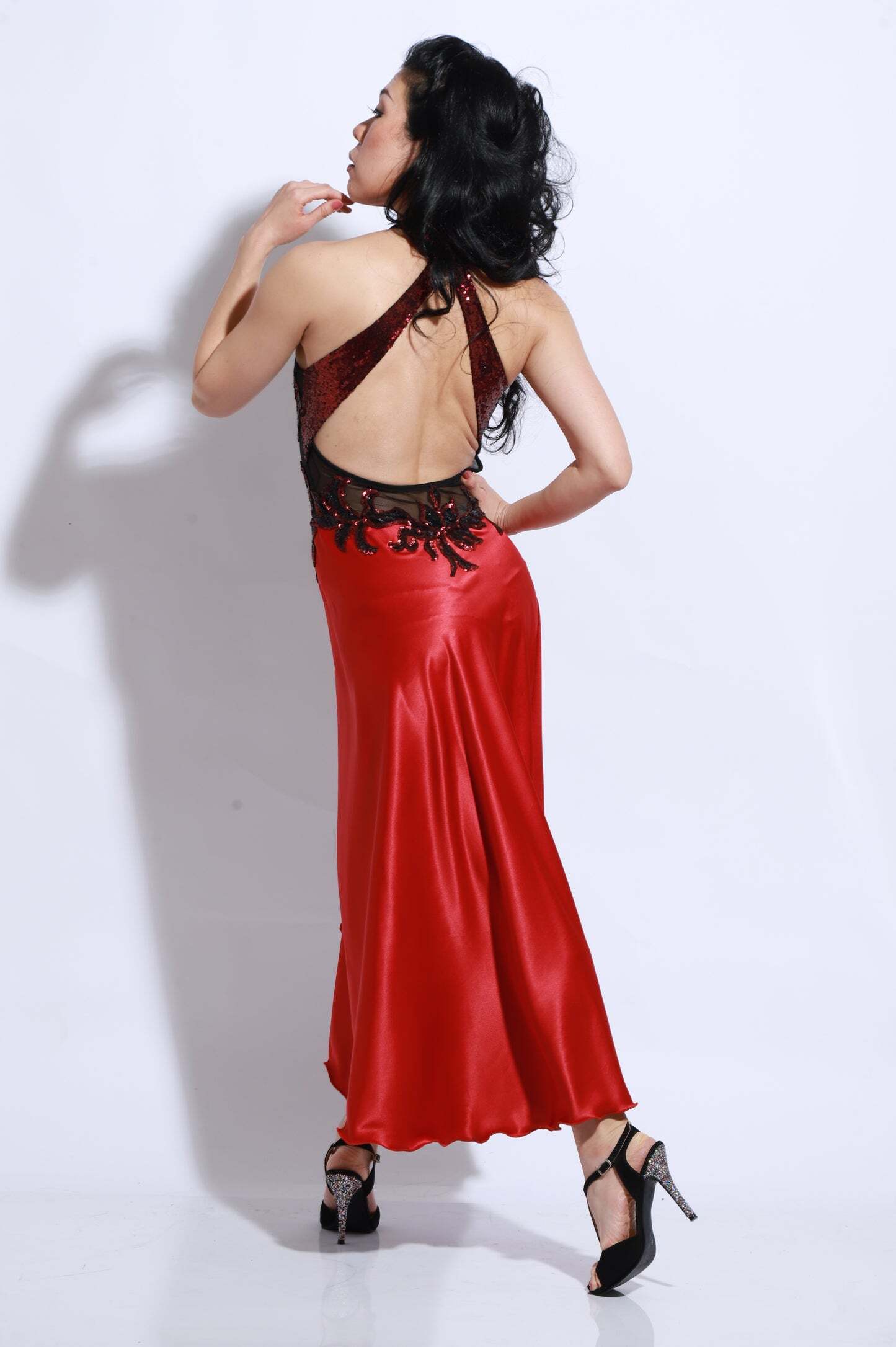 上半身は黒ネット素材、スカート部分は光沢ある赤色サテン素材の組み合わせのステージ用ドレス。
