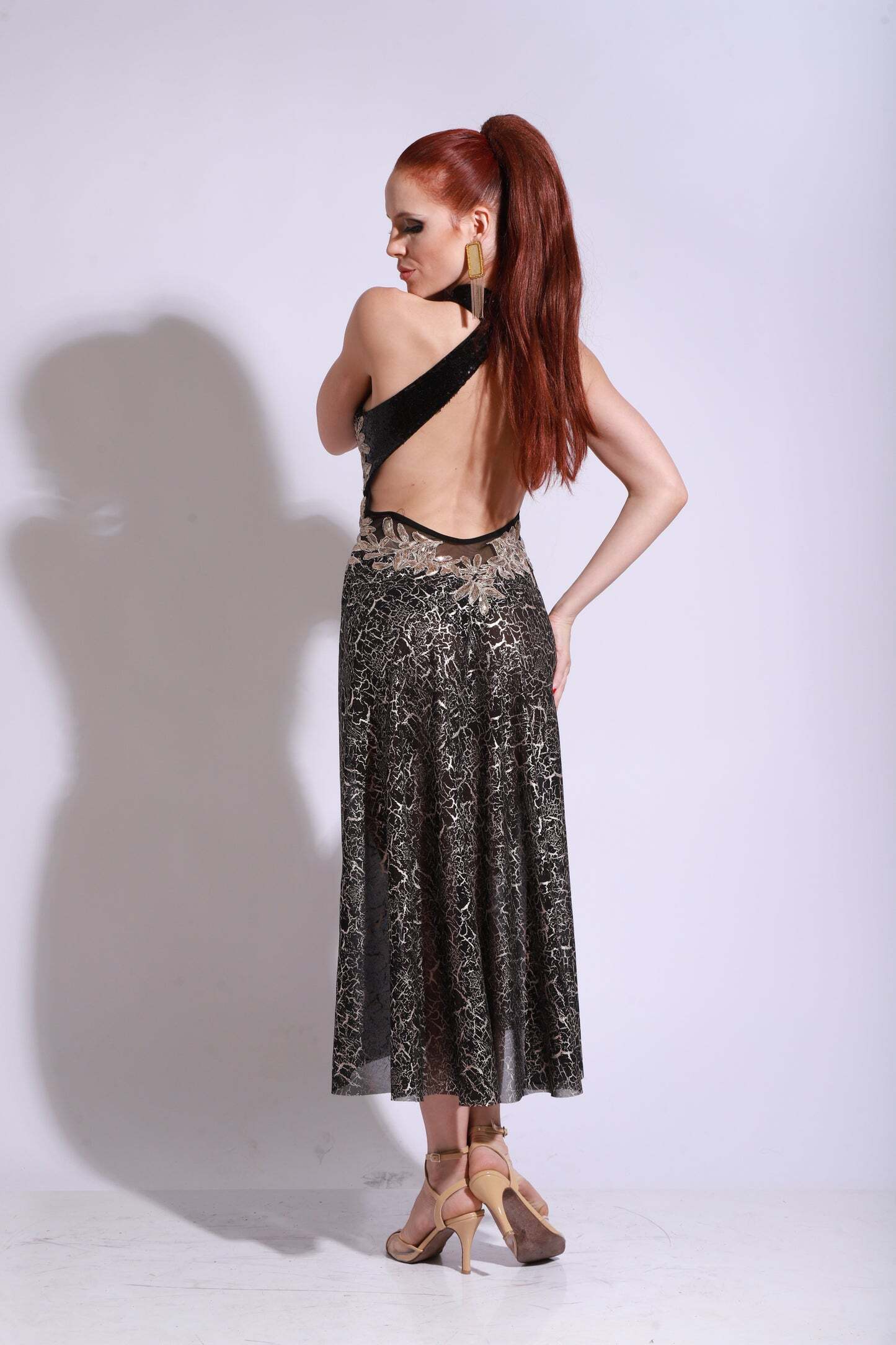 上半身は黒色ネット素材、スカート部分は黒色にゴールドでプリントされているシフォン素材のフレアスカートのステージ用ドレス。