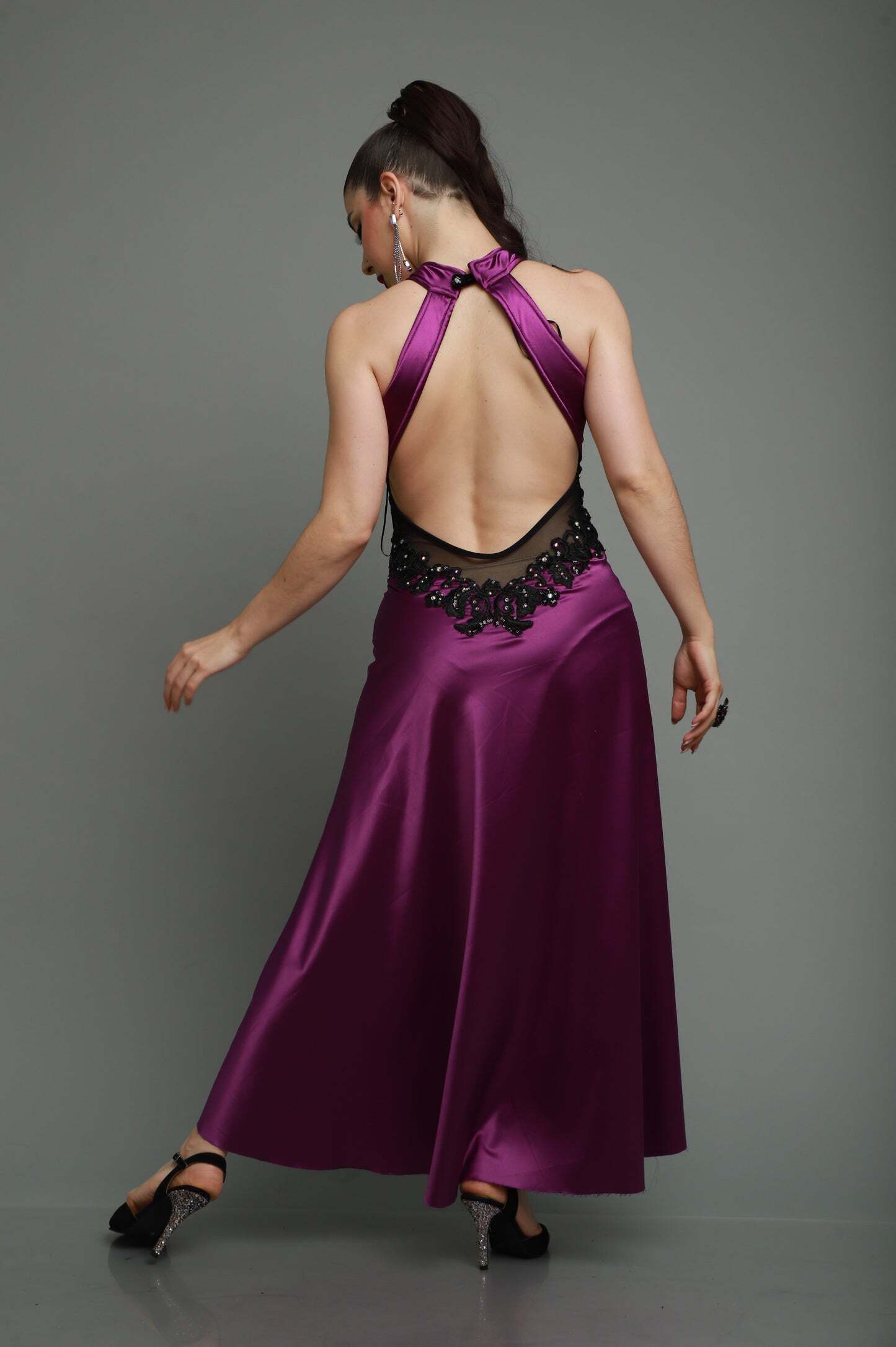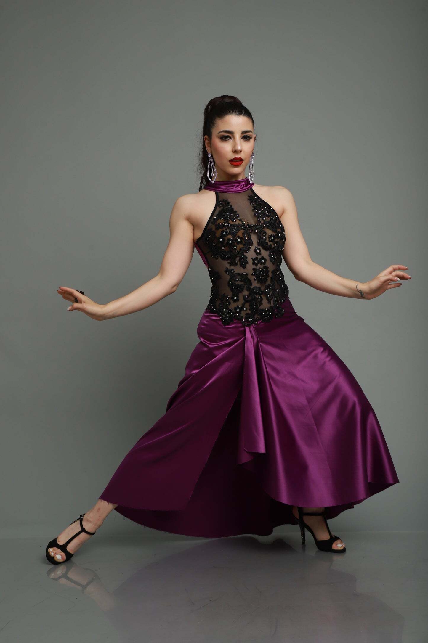 上半身は黒ネット素材、スカート部分は光沢ある鮮やかなパープル色のサテン素材の組み合わせのステージ用ドレス。