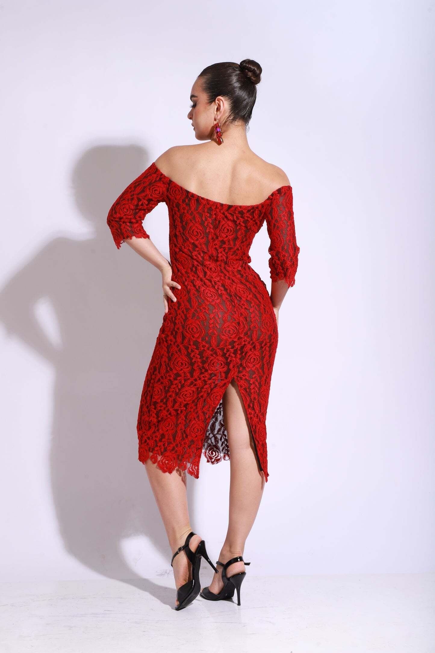 肌色ネット素材に赤レースストレッチ素材が重なったミロンガ用ワンピース。