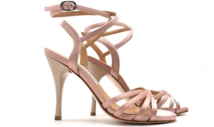 ピンクのサテン素材のサンダルタイプシューズ。